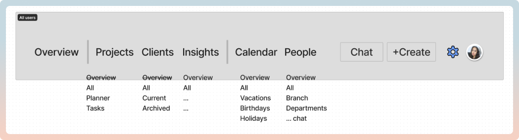 Following this, I initiated wireframing iterations for each navigational item as per the project manager's directives. The redesign process commenced with the dashboard, followed by the calendar, incorporating various views. Subsequently, attention shifted to refining sections for clients, projects, people, profiles, account settings, and insights. Due to time constraints, the design phase couldn't accommodate extensive opportunities for rapid interactive prototyping. However, it managed to achieve the bare minimum by supplementing designs with notes and flows for the dev team. Close communication with the dev team in the fast-paced environment ensured alignment and efficiency in implementation.