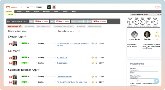 Previously, the dashboard was overly cluttered, featuring holiday information, personal projects, tasks, and irrelevant tabs such as vacation calendars. The redesign was driven by input from the project manager and operations manager, focusing on simplifying the interface.